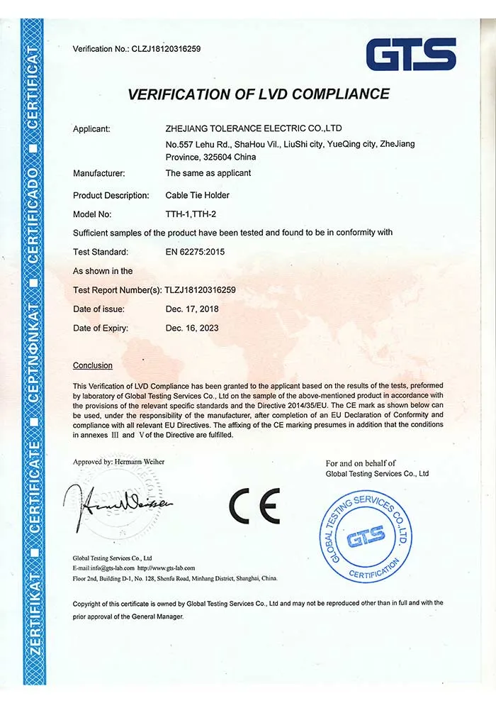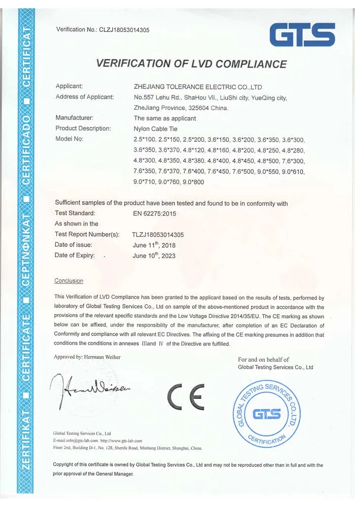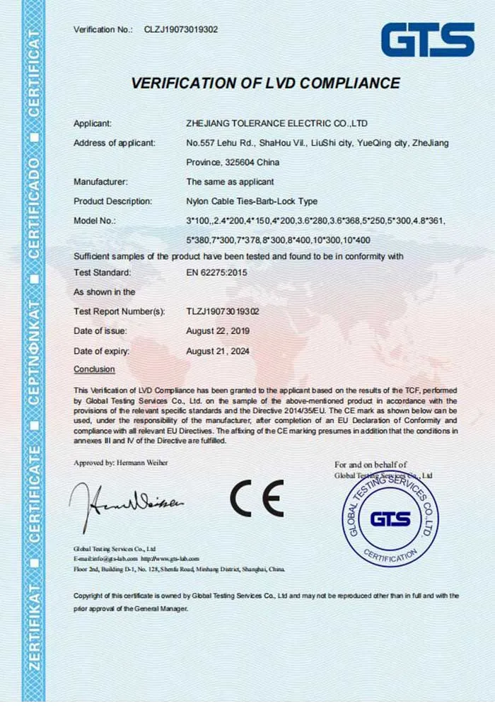 CE Certificate For Nylon Cable Ties-Barb-Lock Type