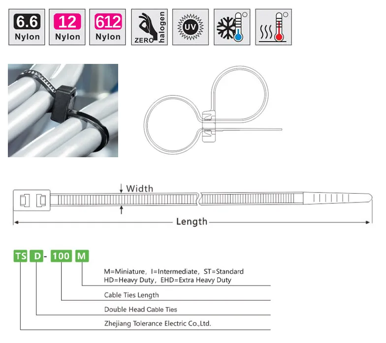 The heads of the double-headed strap are designed as two independent structures with opposite teeth. The strap of the same strap can pass through the two heads in turn to form two independent and connected strapping methods,double-headed, integrated design, easy to operate.Double Head Cable Ties available in bulk 1000 or 500 pieces bags or smaller 100 piece bags.