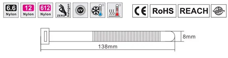 Structural features: Reverse-penetration design. After bundling, the tooth buckles of the tie are outwards. The smooth surface of the tie is in contact with the trapped objects to prevent the tooth buckles from damaging the bundled wires.
