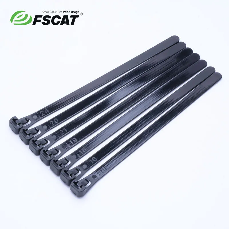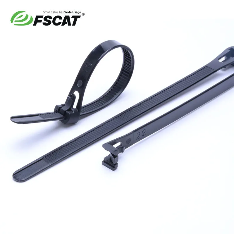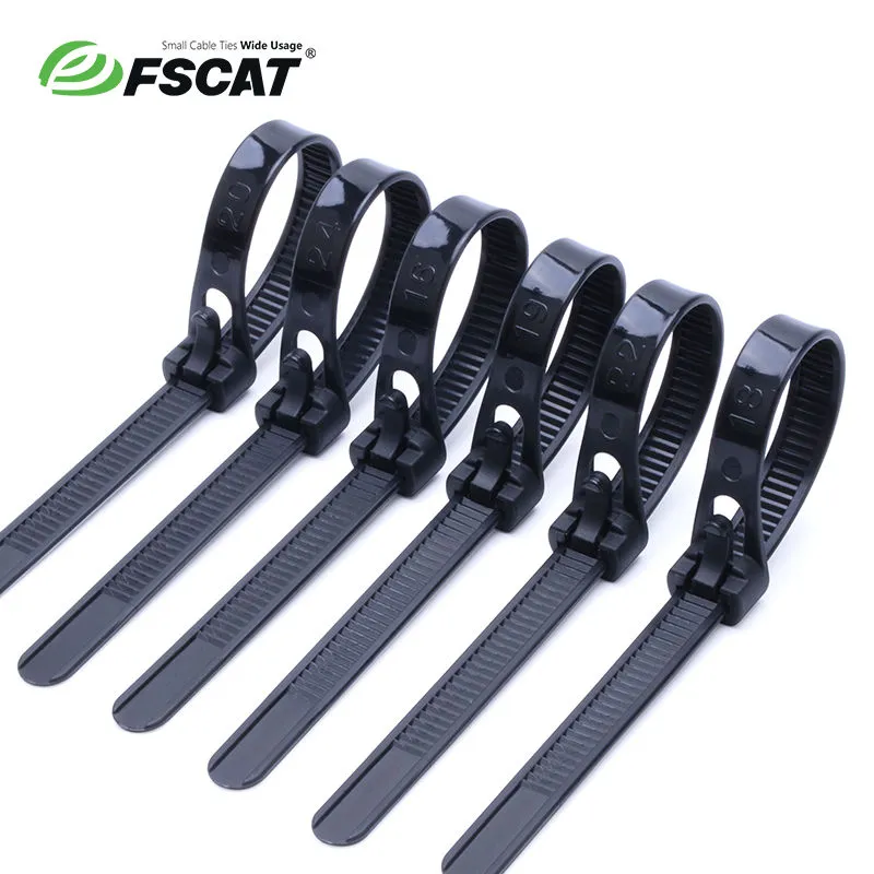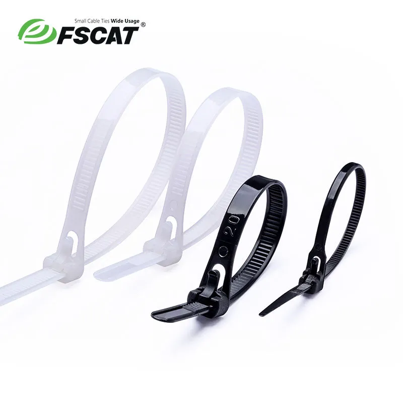 Releasable cable ties offer the perfect solution for those applications requiring reuse or reinstallation of a cable tie. The one piece construction with a releasable feature designed as part of the head of the tie allows for consistent performance and reliability. Natural releasable cable ties are preferred for indoor use applications while UV Black is recommended for outdoor applications, providing greater resistance to ultraviolet light. Releasable cable ties are available in two different designs. One design has an extended pawl or locking mechanism in the head of the tie which can be released with a thumbnail force. The second design has a large horizontal tab feature which releases the tie with a push onto the tab. Releasable Tab Cable Ties are available in lengths from 150MM--400MM(6” – 15.8”) and have a 22KG(50 lb) tensile strength. Releasable Tab cable ties are available in bulk 1000 or 500 pieces bags or smaller 100 piece bags.